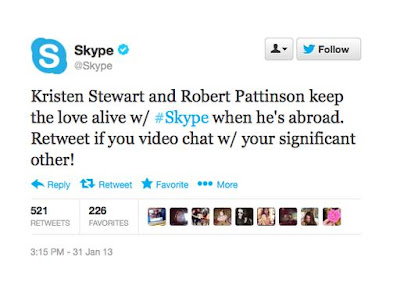 *Seguro ya leyeron sobre los rumores de Rob y Kristen manteniéndose en contacto por Skpe, manteniendo sesiones muy hot vía S! ... buenooo, aprovechando esto Skype mando este tweet a más de sus 363539 seguidores! Un tweet alentando a la gente que se comunique con lo más importante en su vida cuando la otra persona esta al otro lado del mundo... cute! Pero que opinaran Rob y Kristen ??