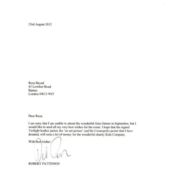 Lamento no poder asistir a la maravillosa Cena de Gala en septiembre, pero me gustaría enviar todos mis mejores deseos para el evento. Espero que la chaqueta de cuero firmada de Twilight, del "On Set Picture"'y el poster de Cosmopolis que tengo que donar, recaude mucho dinero para la maravillosa caridad de Kids Company.
